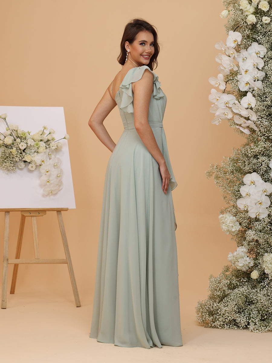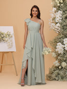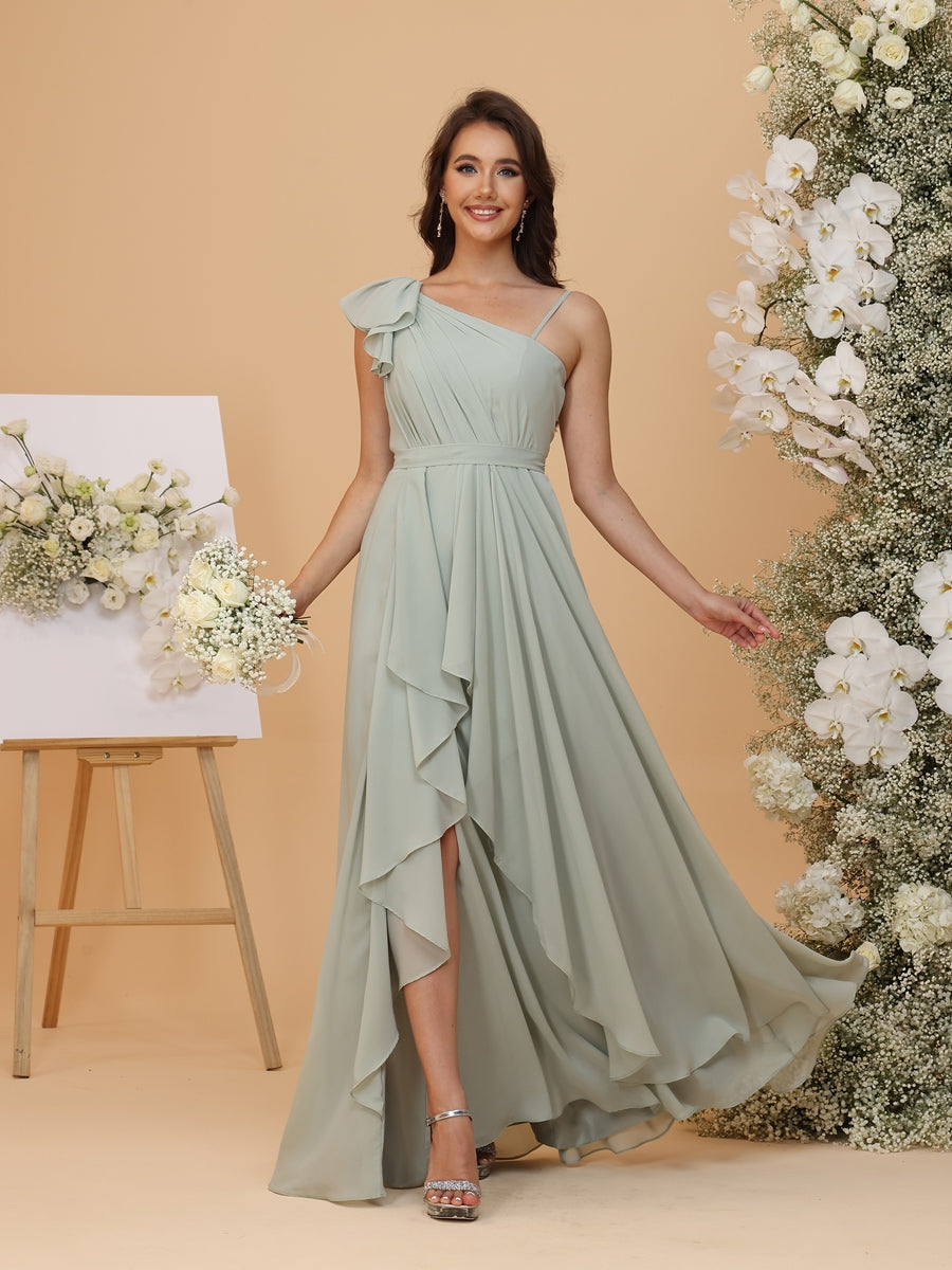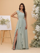 #MRA22312166 A-Line/Princess Asymmetrical Neck Long Bridesmaid Dresses with Ruffles & Split Side