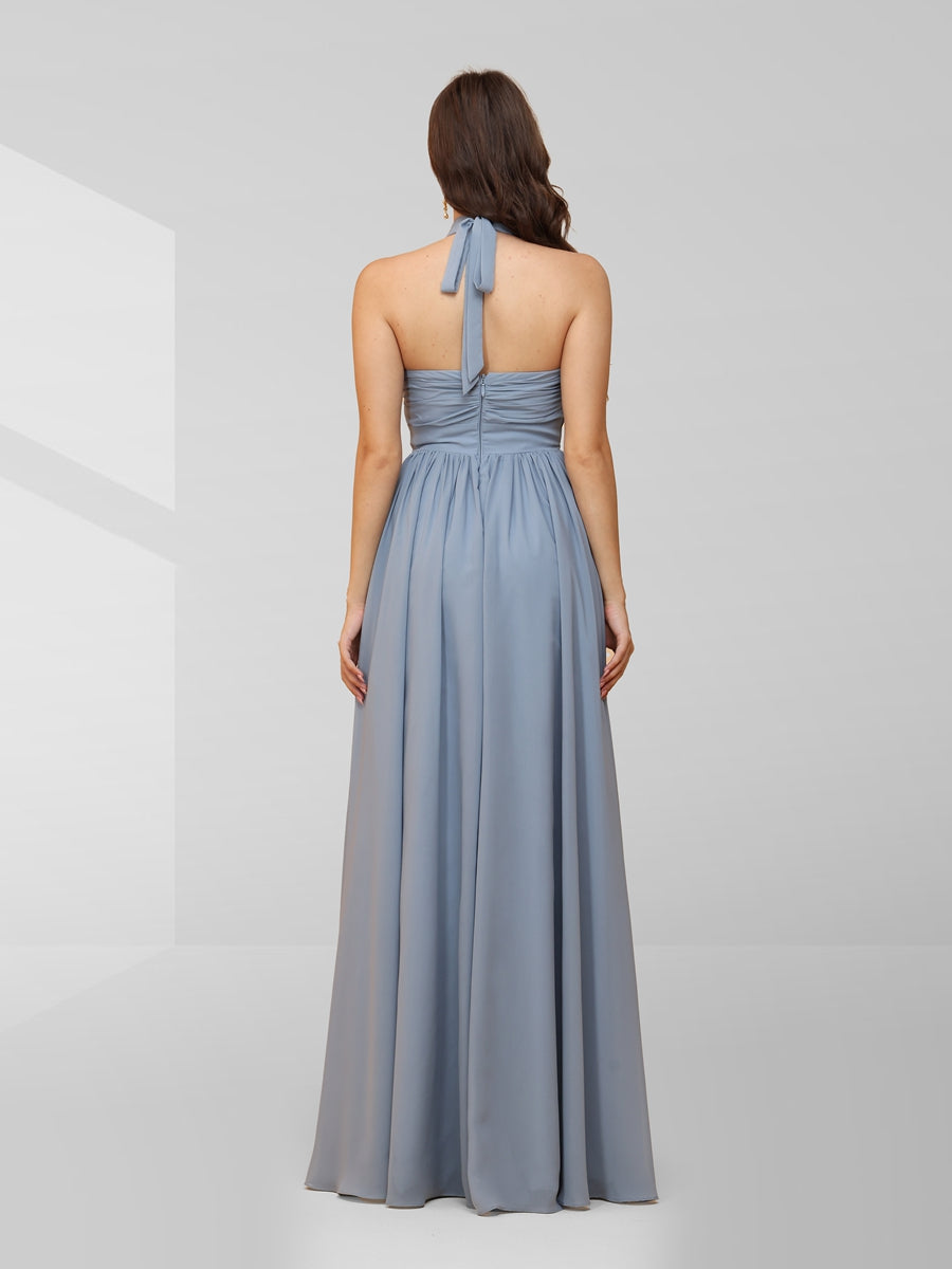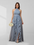 #MRA22472168 A-Line/Princess Halter Sleeveless Ruched Evening Dresses with Ruffles & Belt