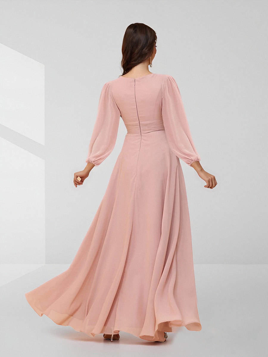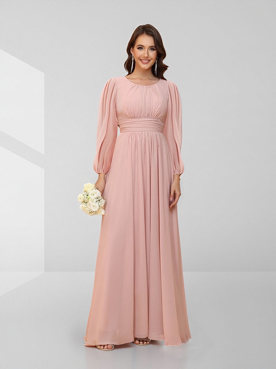 #AMRA22312165 A-Line/Princess Scoop Long Sleeves Ruched Chiffon Evening Dresses with Ruffles