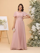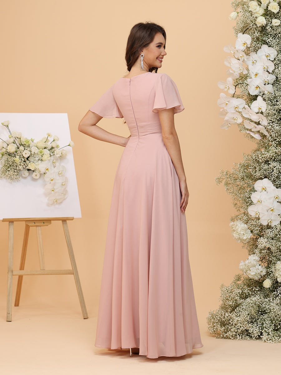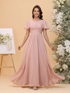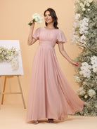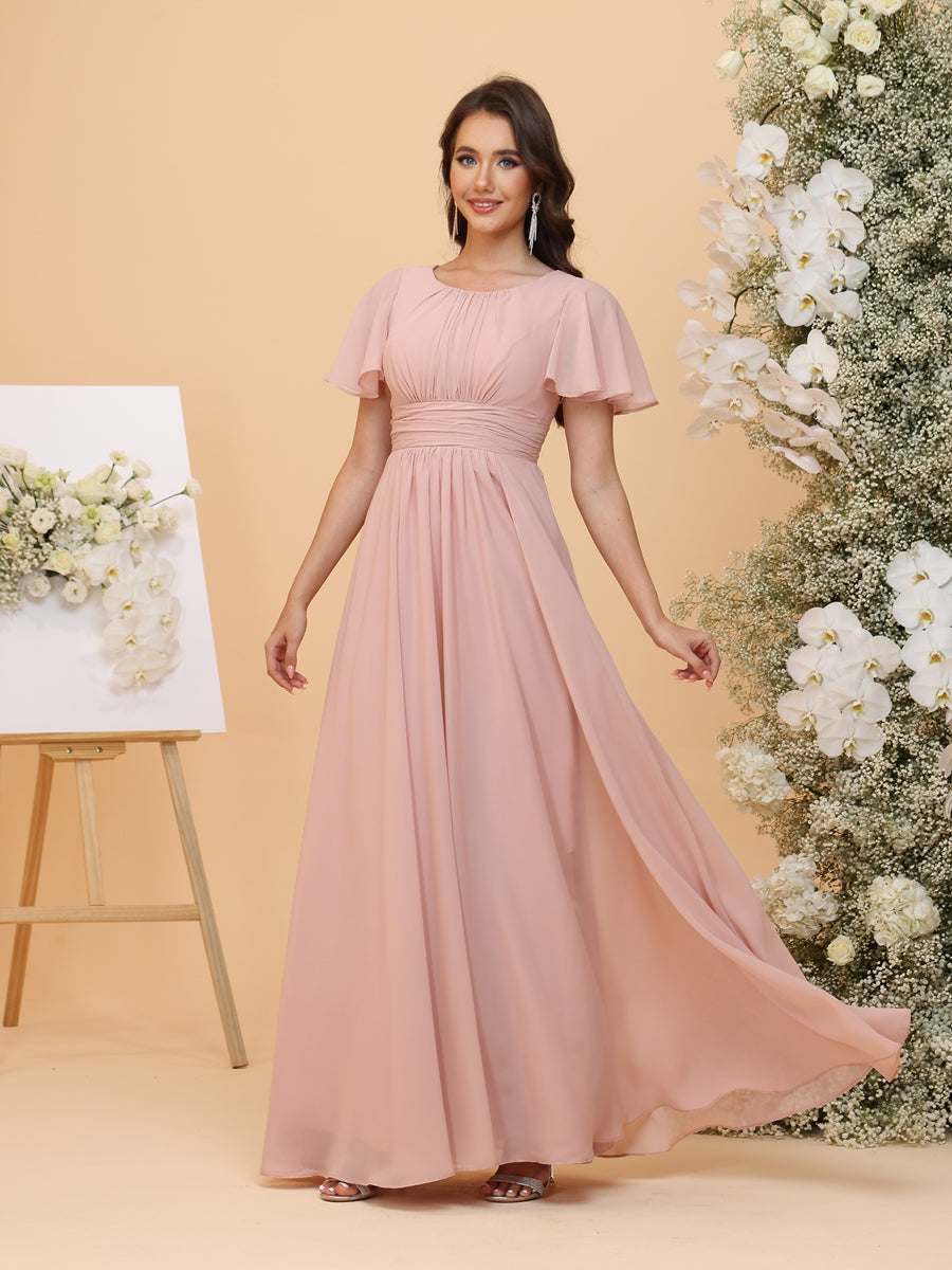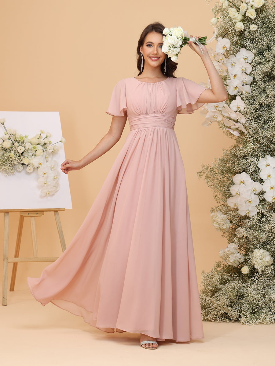 #MRA22312165 A-Line/Princess Scoop Short Sleeves Ruched Chiffon Bridesmaid Dresses with Ruffles