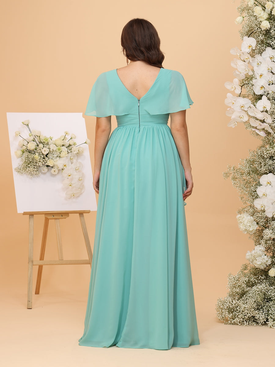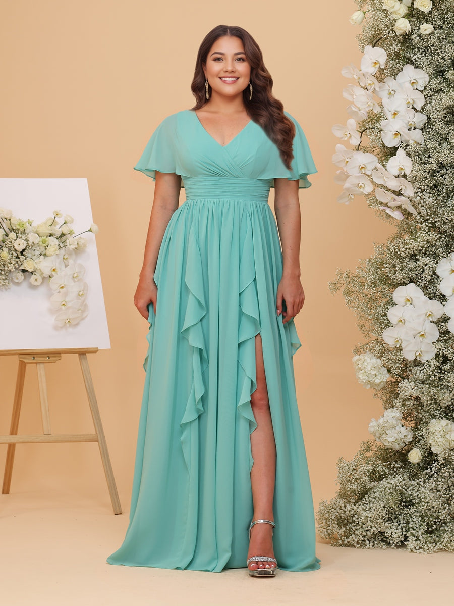 #MRA22312163P A-Line/Princess V Neck Cap Sleeves Ruched Plus Size Bridesmaid Dresses with Ruffles & Split Side