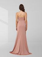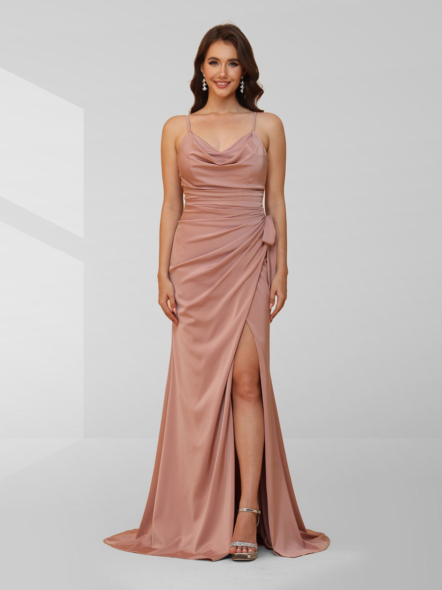#MRA22472149 Sheath/Column Spaghetti Straps Ruched Evening Dresses with Bow & Slit Side