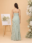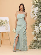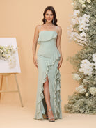 #MRA22312164 Sheath/Column Spaghetti Straps Ruffled Chiffon Bridesmaid Dresses with Slit Side