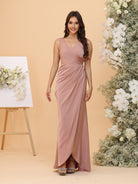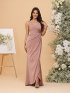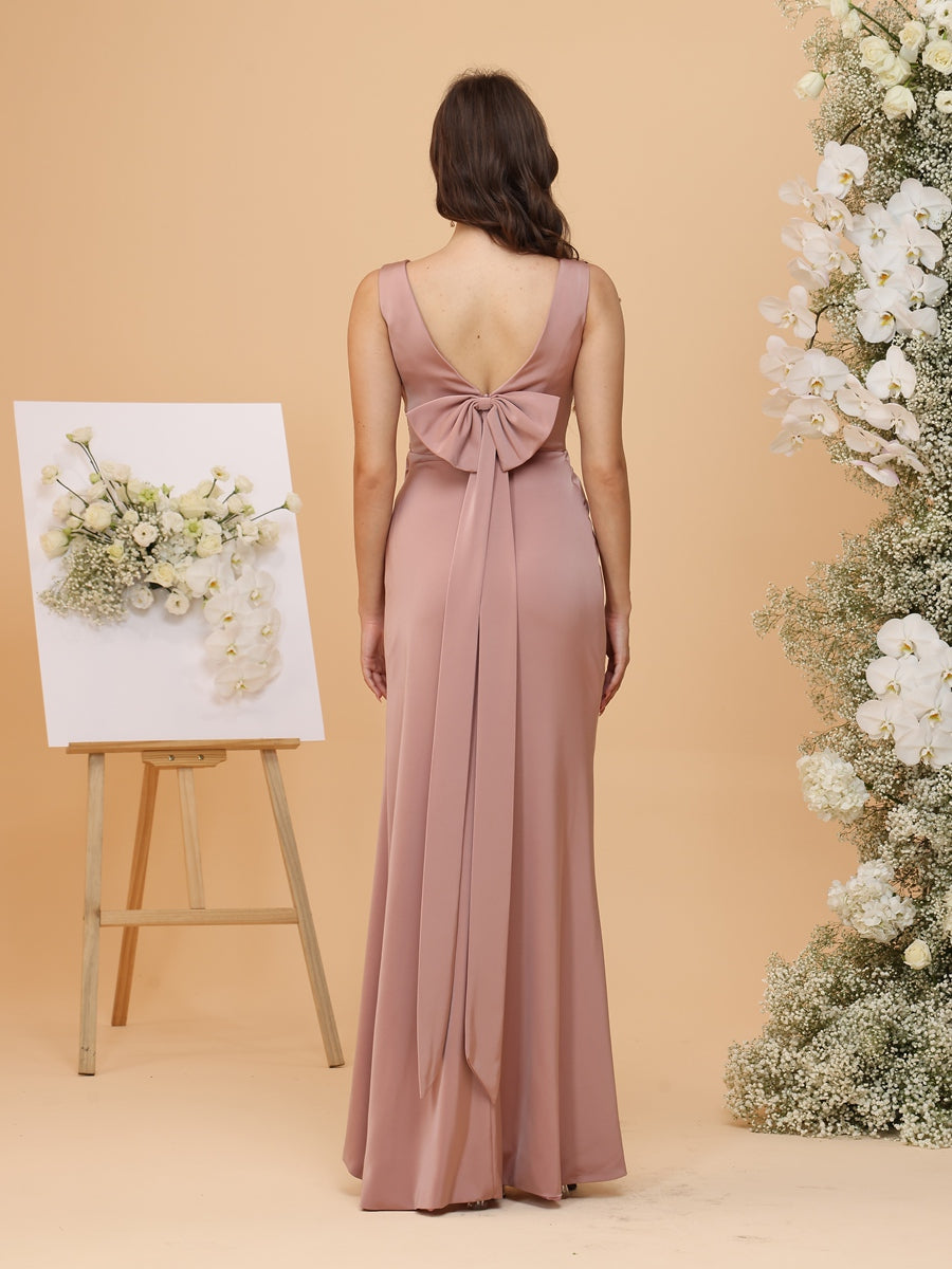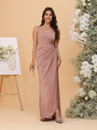 #MRA22312169 Sheath/Column V-Neck Ruched Asymmetrical Bridesmaid Dresses with Bowknot