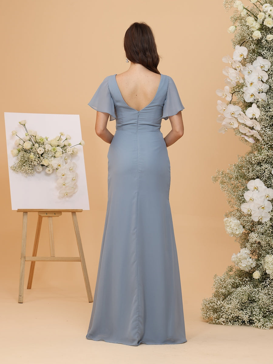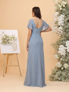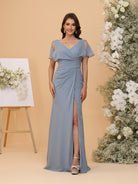#MRA22312153 A-Line/Princess V-Neck Short Sleeves Ruched Bridesmaid Dresses with Ruffles & Slit Side