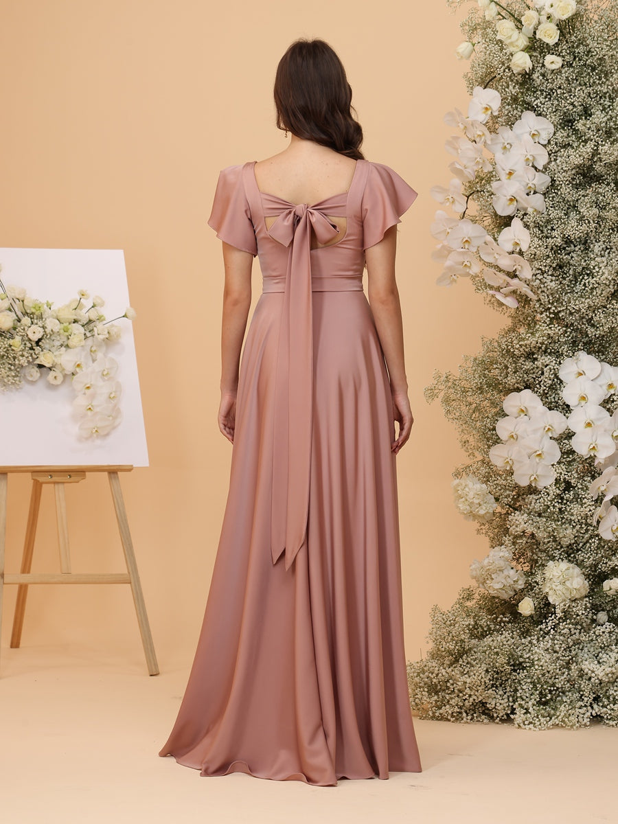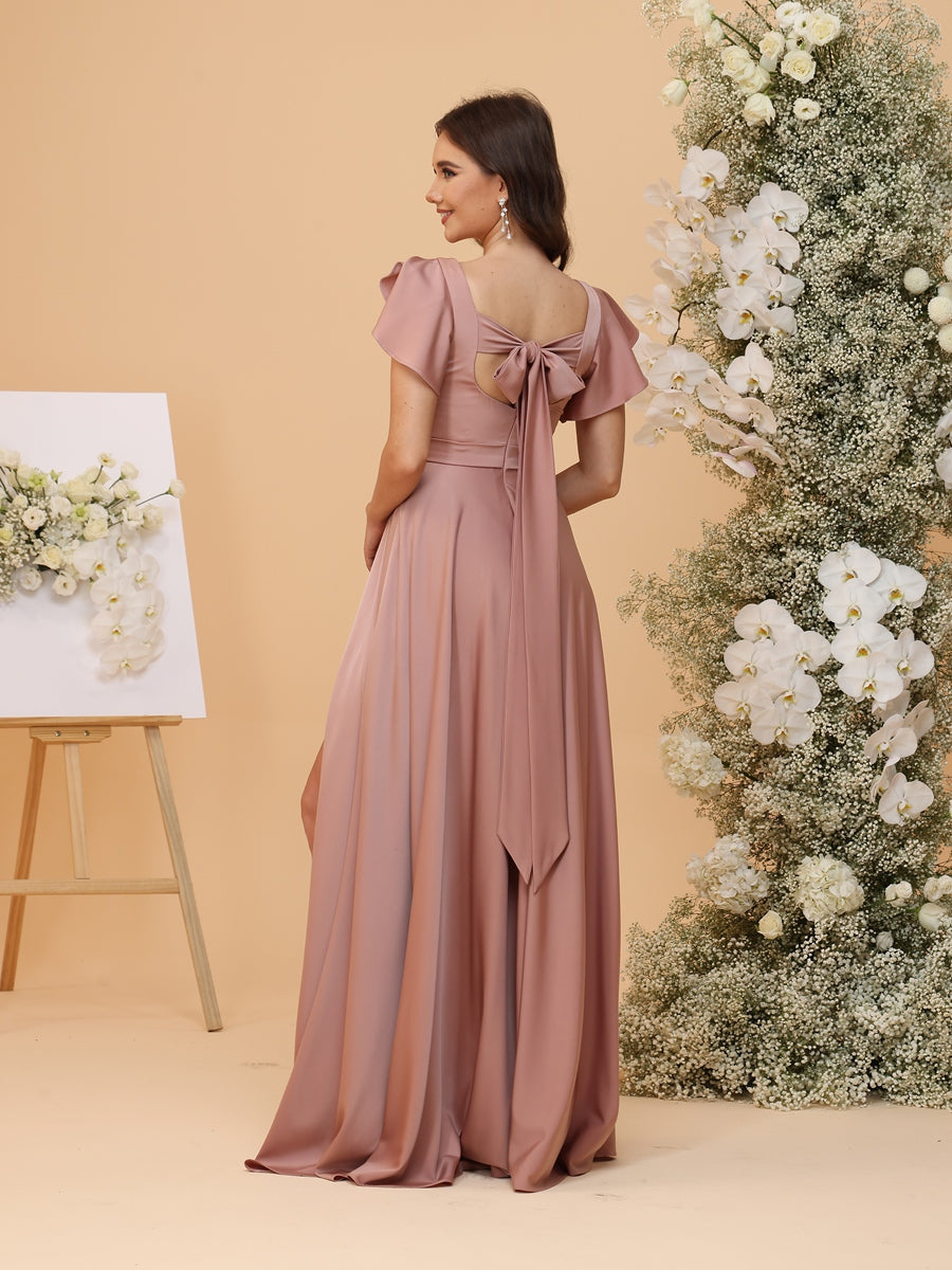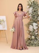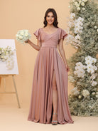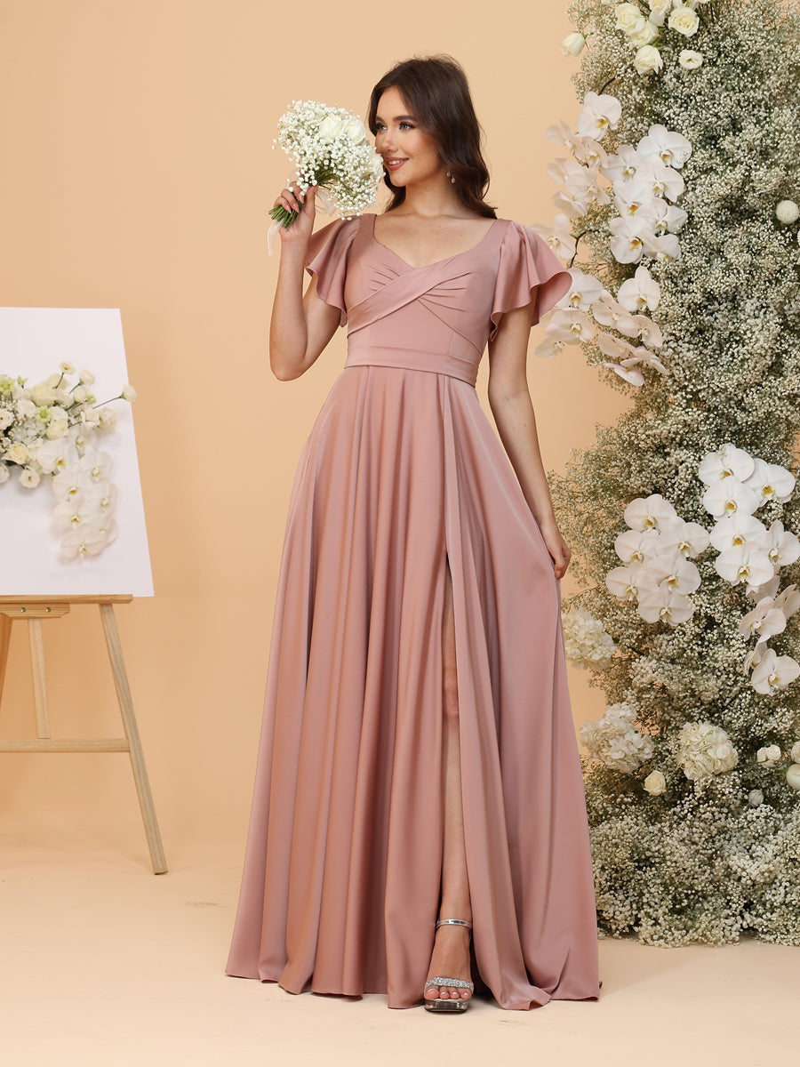 #MRA22312142 A Line V Neck Short Sleeves Ruched Bridesmaid Dresses with Split Side & Pleats