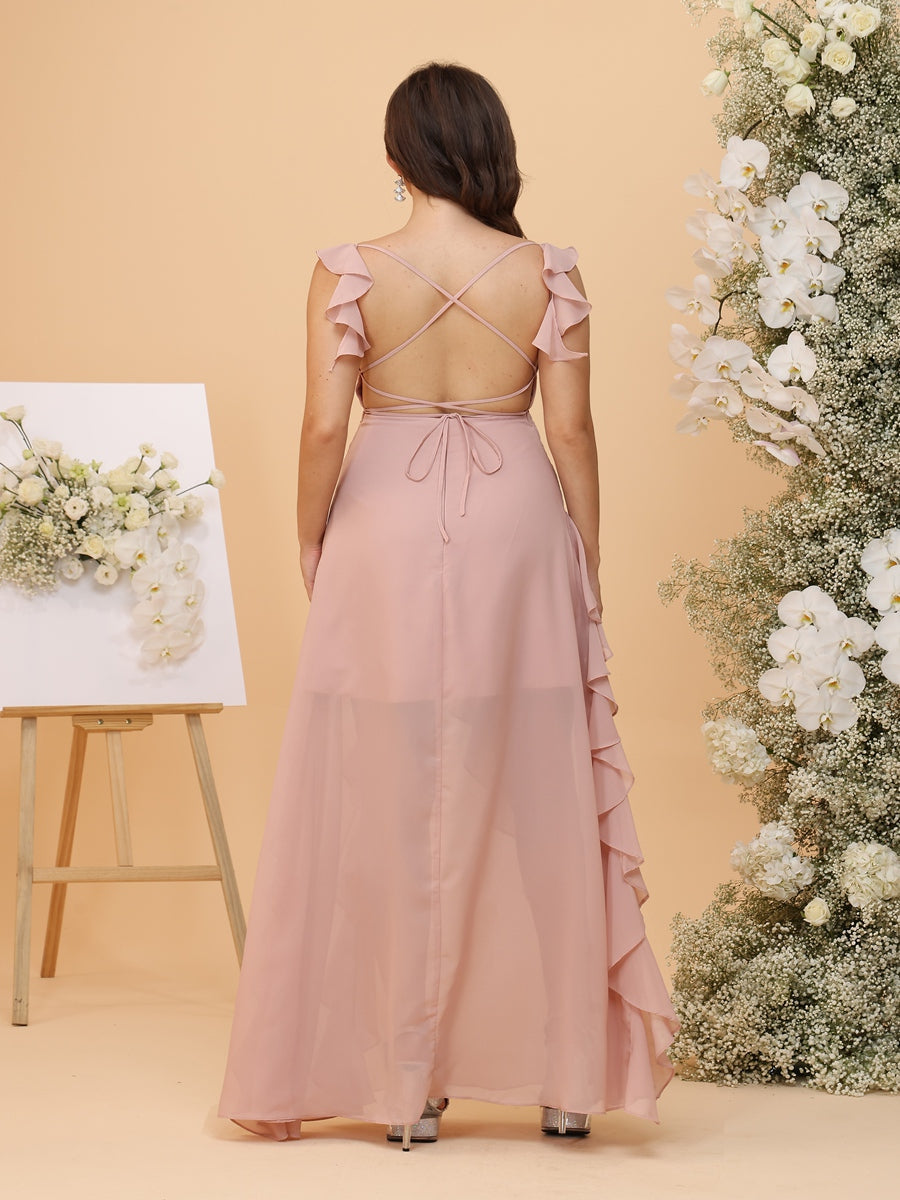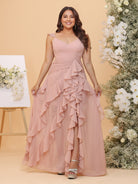 #MRA22312155P A Line Sleeveless Ruched Floor-Length Plus Size Bridesmaid Dresses with Ruffles & Split Side