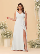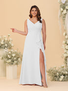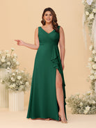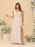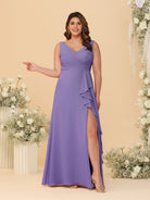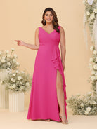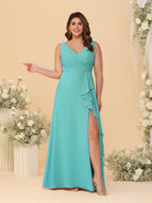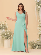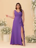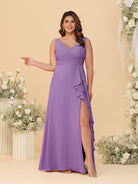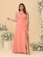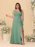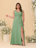 #MRA99122075P A-Line/Princess V-Neck Sleeveless Ruched Chiffon Plus Size Bridesmaid Dresses With Side Slit & Ruffles
