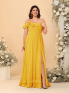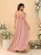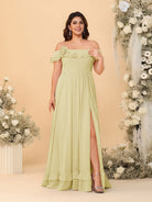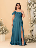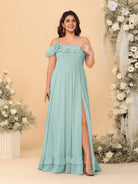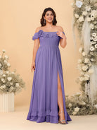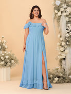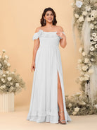 #MRA99122123P Chiffon A-Line/Princess Off-the-Shoulder Short Sleeves Plus Size Bridesmaid Dresses with Side Slit