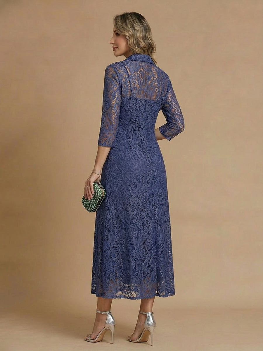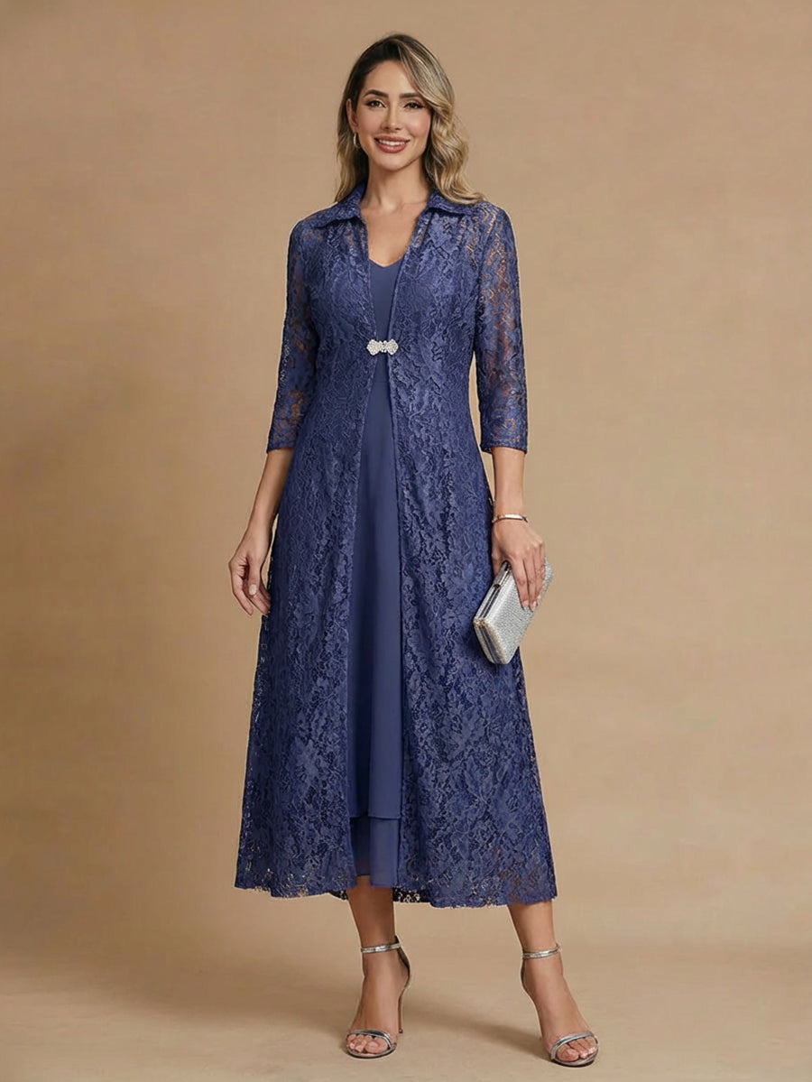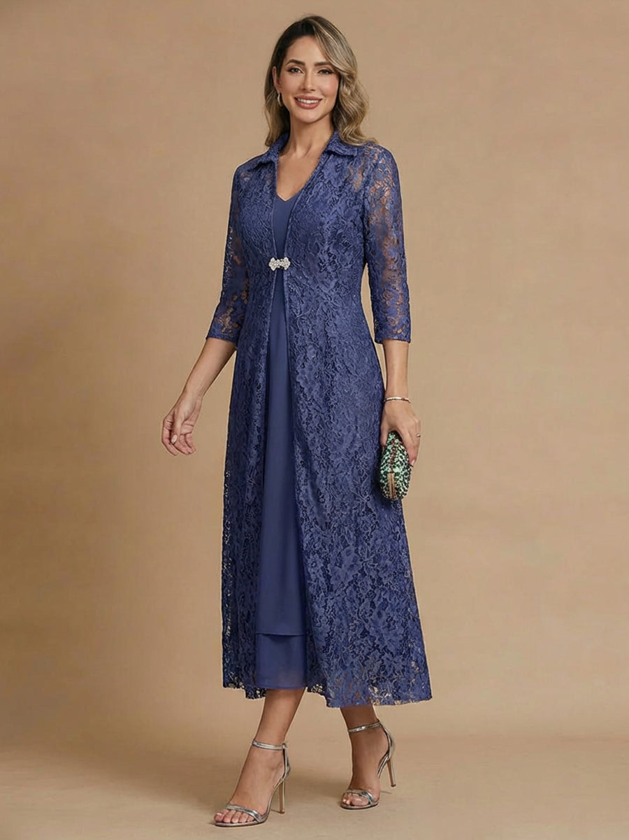 #MRA368002 2 Pieces Mother of the Bride Dresses A-Line/Princess V-Neck 3/4 Sleeves Tea-Length Formal Dresses Chiffon Dresses With Appliques Lace Jacket