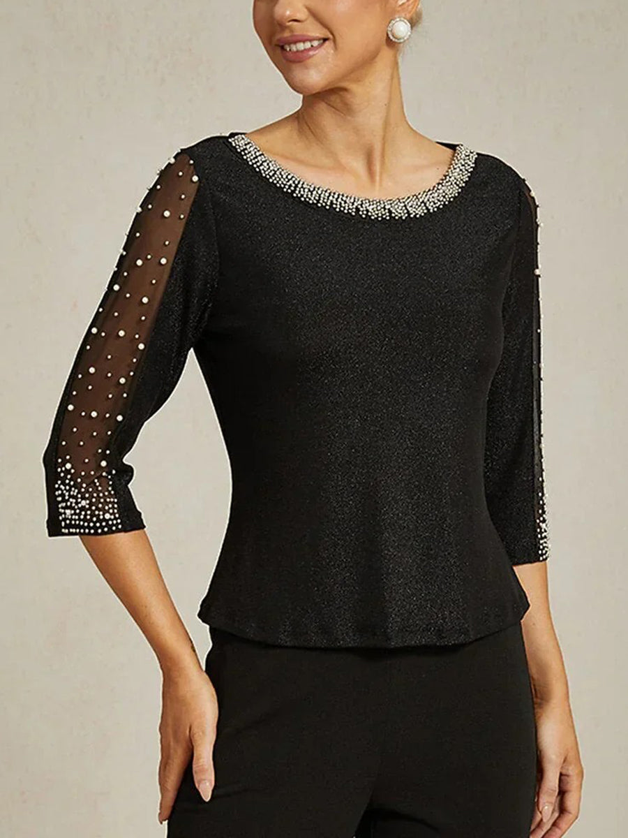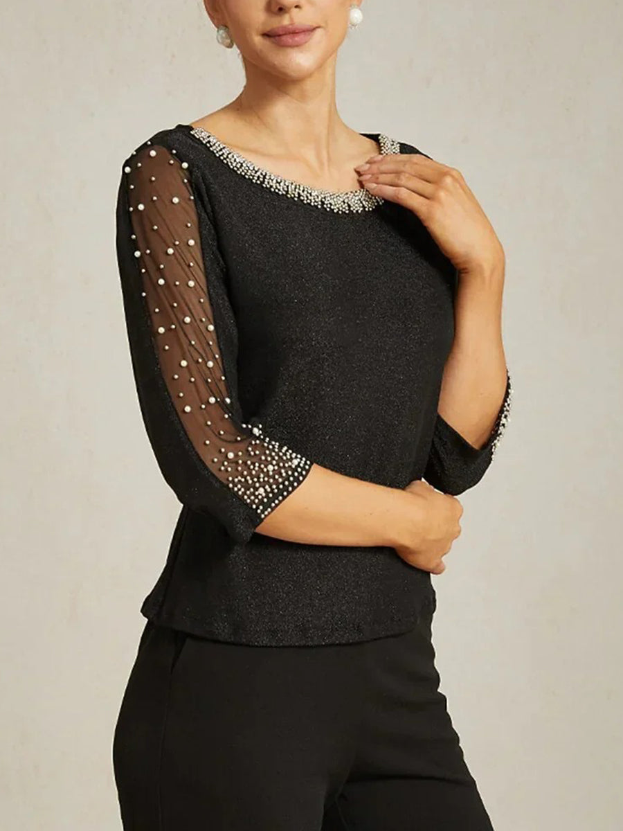 #MRA357712 2 Pieces Mother of the Bride Pantsuits Satin Sequin Scoop Neck Lace Half Sleeves Ankle-Length With Beads