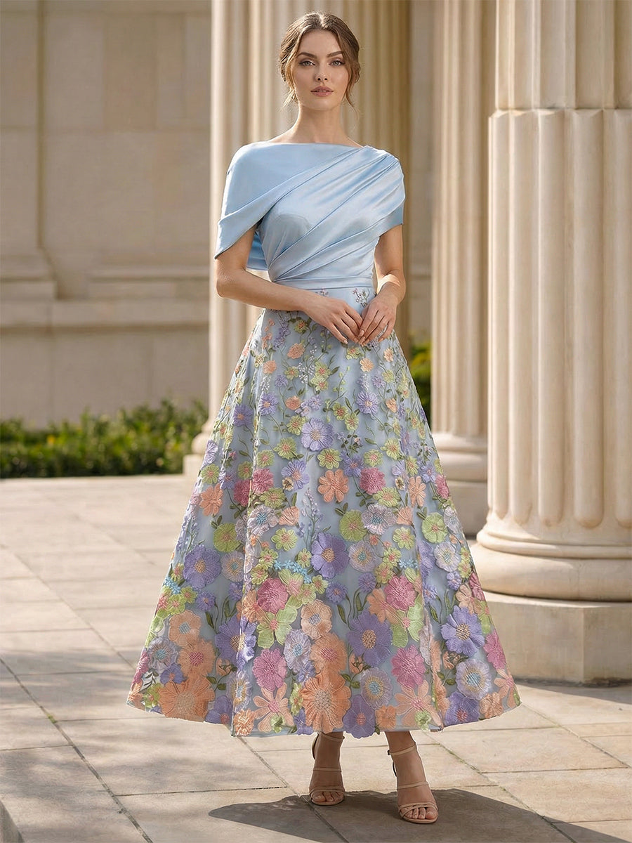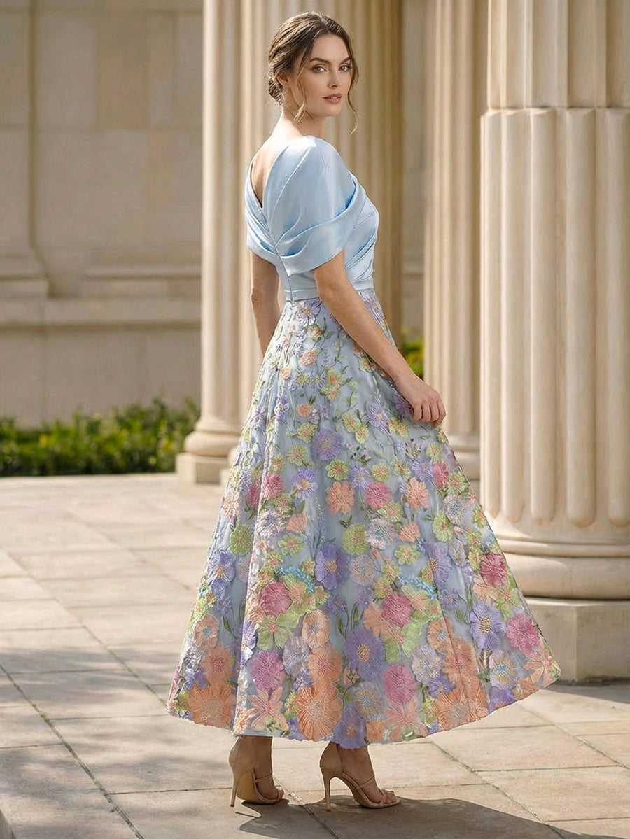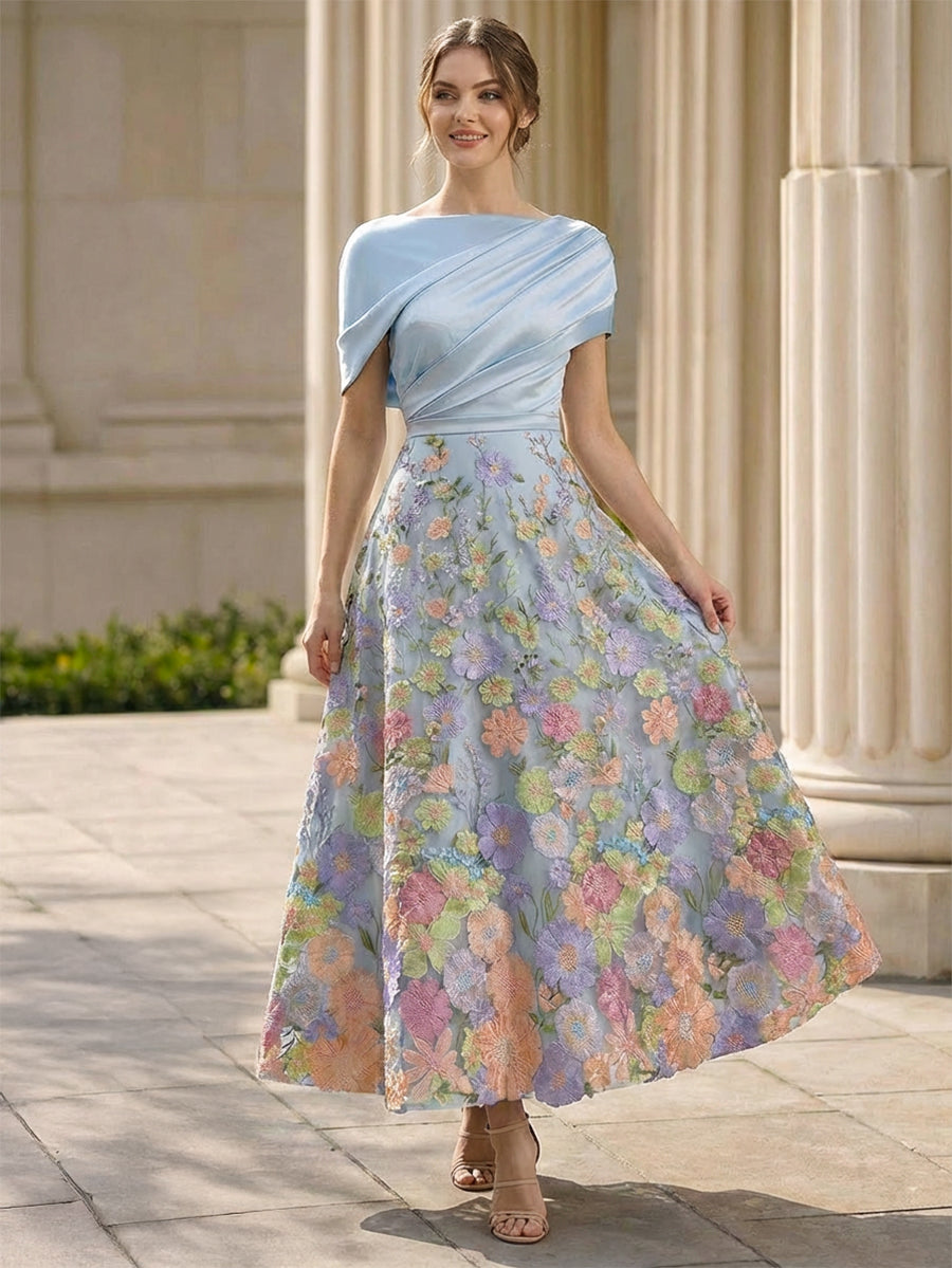 #MRA460401 A-Line/Princess Cocktail Dresses Formal Dresses Scoop Neck Short Sleeves Ankle-Length Floral Dresses Satin Lace With Embroidered Flower Embroidery Pocket