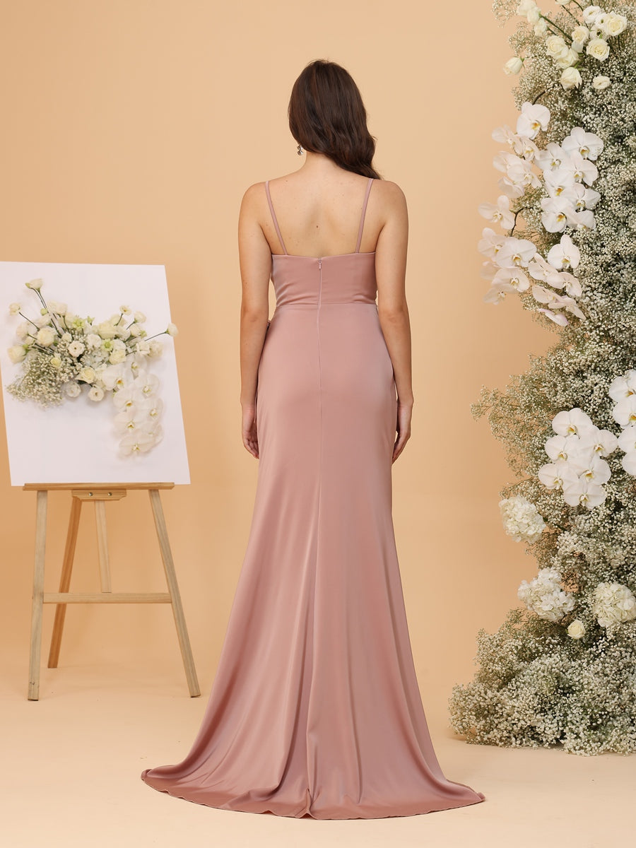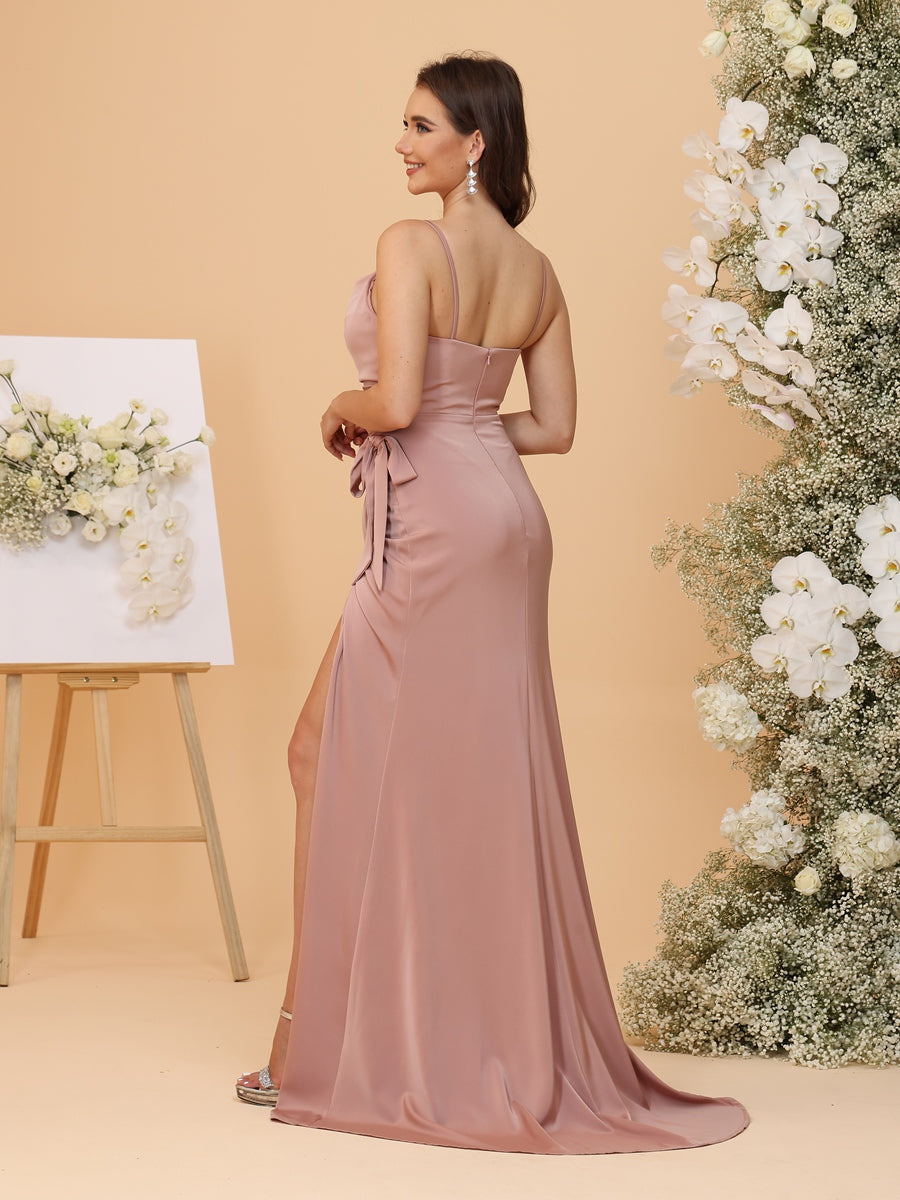 #MRA22312149 Sheath/Column Spaghetti Straps Ruched Bridesmaid Dresses with Bow & Slit Side